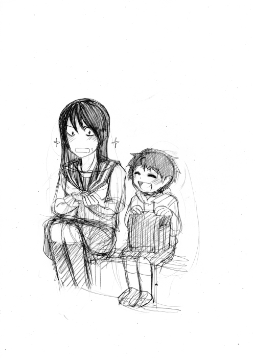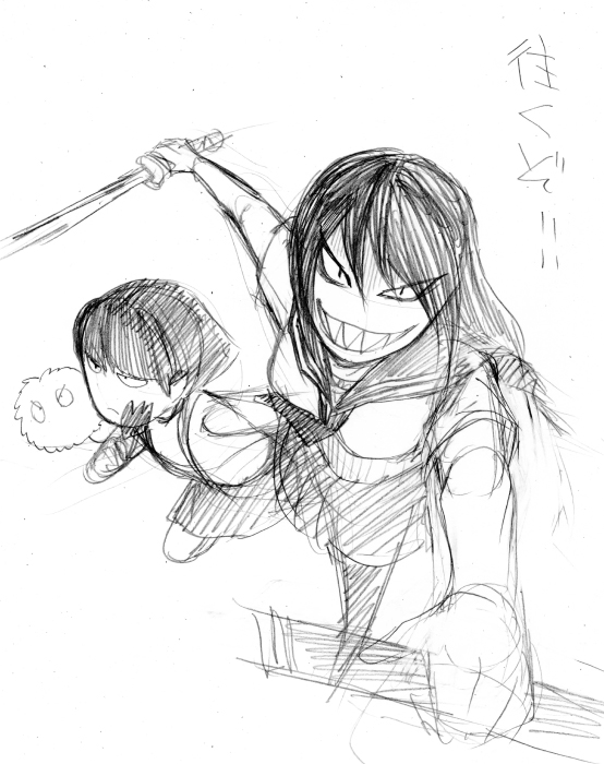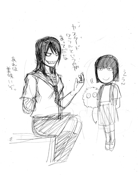 皆さんはどちらを購入されたのでしょうか?私は両方です。 ブラックに主人公♀、ホワイトに主人公♂で冒険を始めております。 皆さんはもうバッヂ全部揃えましたか?私はまだひとつです。レベル上げタノシー! そして今回のポケモンはDSだけじゃなくてネット通信でも楽しめる『ポケモングローバルリンク』というものができましたよね、今はサービス一時停止してるけど。コノヤロー! 今回のポケモンで、初めて人間キャラクターが可愛いと心のそこから思いました。 え?誰かって?そんなの決まってるじゃないですか。 ベルちゃんですよ、ベルちゃん。本当に可愛い。妾にしたい。 チェレンは…その、なんだ。将来を悲観しないで、今から頑張ればきっと悩み無用になるから。今からヘアケアちゃんとすればきっと間に合うから…うん…がんばれ。 N?苗字が「エ」で名前が「ヌ」の人?ひどい名前だよな、キラキラネーム(笑)の魔の手がポケモンにまでやってきたのか。役所に行って改姓してもらえよ。 山田ヌとか佐藤ヌとか鈴木ヌとか…名前も変えてもらえよ。 ブラックの主人公♀の性格、なんかトレーナーカードに「がんばりや」って書いてあったけど、 私の脳内じゃ彼女はマイペースで、思ったことはすぐ口に出て、人の話を聞かないですぐどっかいっちゃう明るい子。名前はナナミでポケモンはミジュマル。名前はぼのぼの。 ポケモンプレイして初めての女主人公でプレイ。この子も可愛い。 ホワイトの主人公♂の性格はナナミと一緒でトレーナーカードに「がんばりや」って書いてあったけど(ry 彼はベルちゃんにぞっこん。ベルちゃんの前ではめっちゃいい奴。 チェレンがダブルバトルでしきりに「みずあそび」を使って炎の威力を下げるあたり二人は仲が悪いと推測。 名前はロクスケでポケモンはポカブ。非常食。 そしてナナミとロクスケの旅の目標は『ピカチュウを手に入れること。』 はやくグローバルリンク再開しろコンチクショー! PR 学校の怖いウワサ キリコさんが来た! ぼくの学校には『キリコさん』という噂話があります。 それは深夜3時に学校の裏山にある寂れた祠の前を通ると、キリコさんが現れて持っている日本刀で斬り殺されるというものです。 友達の先輩に、キリコさんに会ってしまって殺された人がいるそうです。 …というカンジ。 そんなウワサがあるけど、実はキリコさんは縁切りの神様で悪い縁だけを斬ってくれる。 昔はちゃんと奉られてたんだけど今は奉る人もいなくなってちょっぴりさみしかったりする。 一人称は私で、武士語をしゃべる。 望月少年にもらったカスタードワッフルが大好物。 学校の怖いウワサ 花子さんが来た!にでてくる花子さんとはガチの親友。 カスタードワッフルのうまさを熱弁するキリコさん。 共闘したい。 この二人が組めばポンキッキで放送されたアニメ 『学校のこわいウワサ花子さんが来た!』で花子さんがやっつけられなかった霊もやっつけられるはず。 かきてー。 でも原稿やらなきゃ。 以下拍手返信。